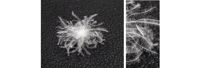 この羽毛はダウンとも呼び、拡大すると四方に細かい毛を伸ばし丸い形状になっています。