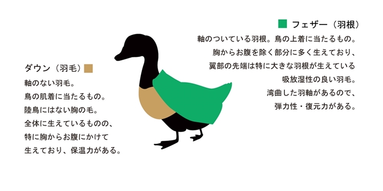 羽毛(ダウン)は弾力があり、この弾力も暖かさを左右するポイントです。