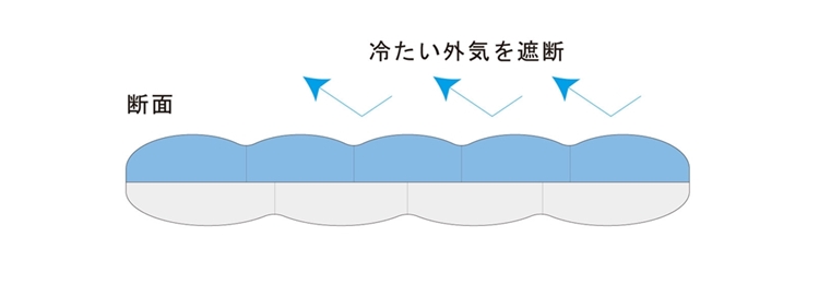 立体縫製により構造の違う2層にし、上部は冷たい外気を遮断。