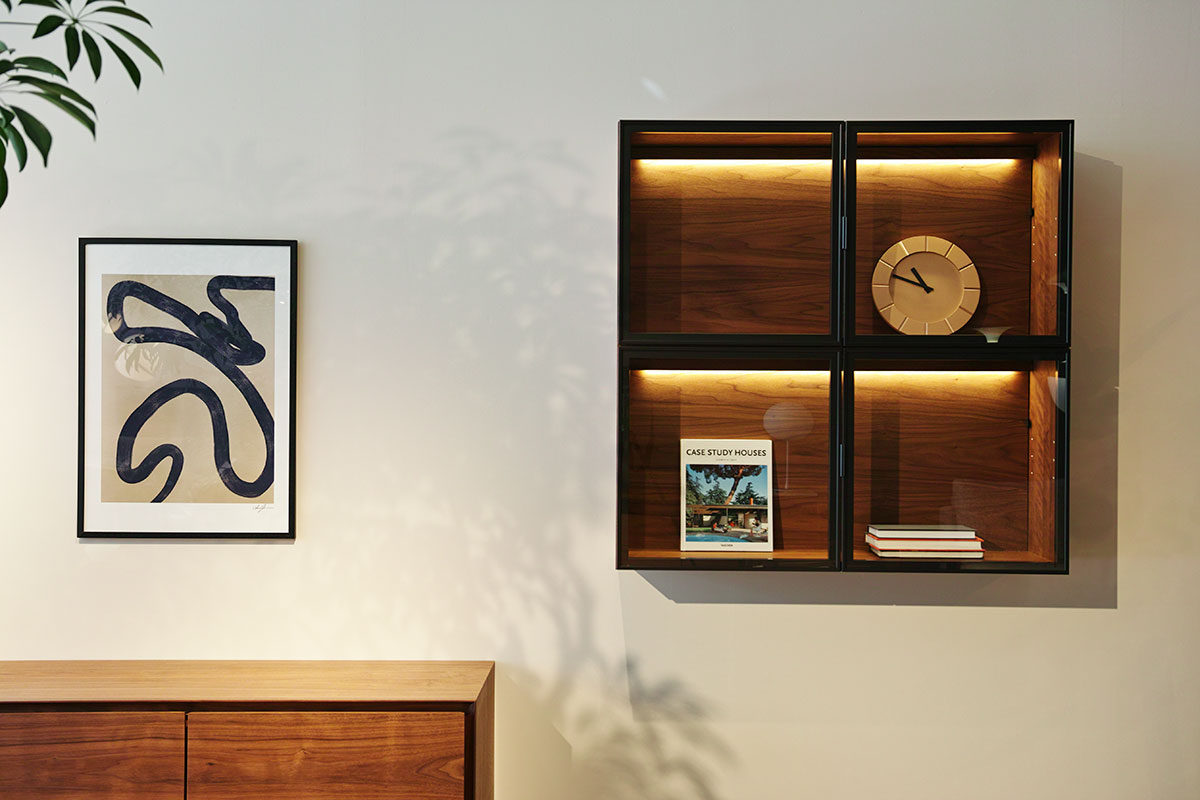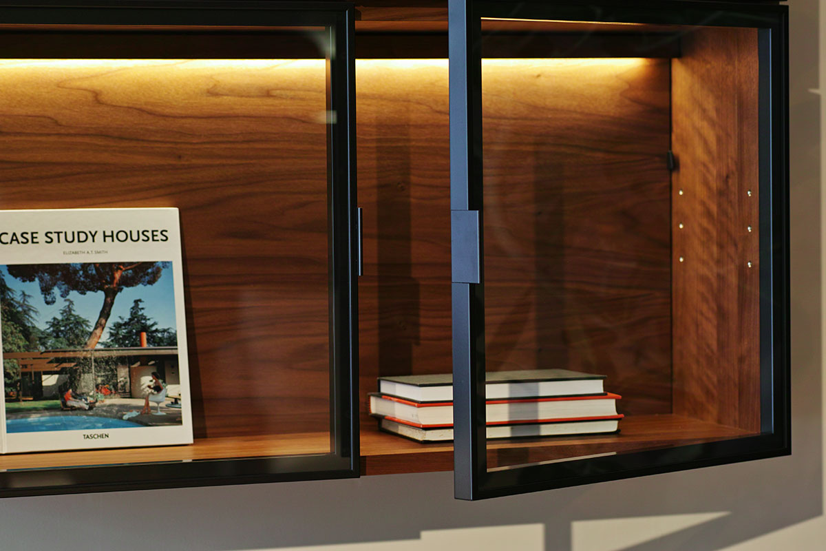 アルミフレームのガラス扉がミニマルな壁面収納。