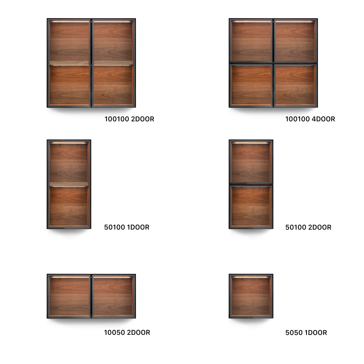 飾り棚として収納物が引き立つように、蝶番金具やビスなどの構成素材が極力目につかないように配慮されています。