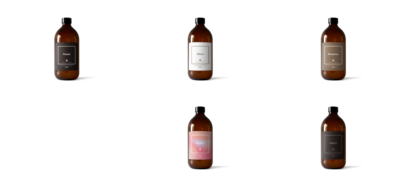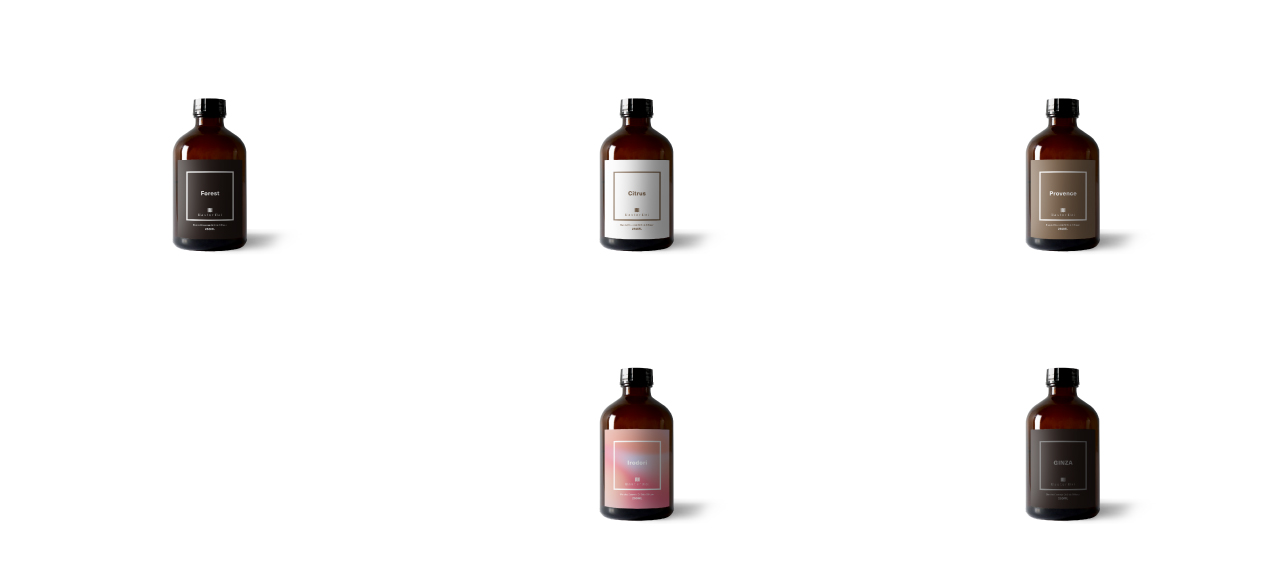 精油100%の5種の香りと、使用シーンに応じたスプレーやディフューザーのプロダクトでお楽しみいただけます。