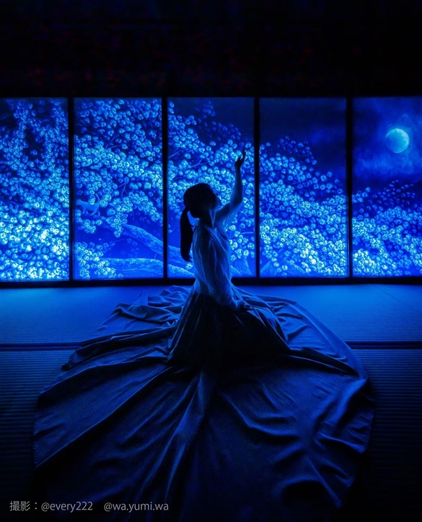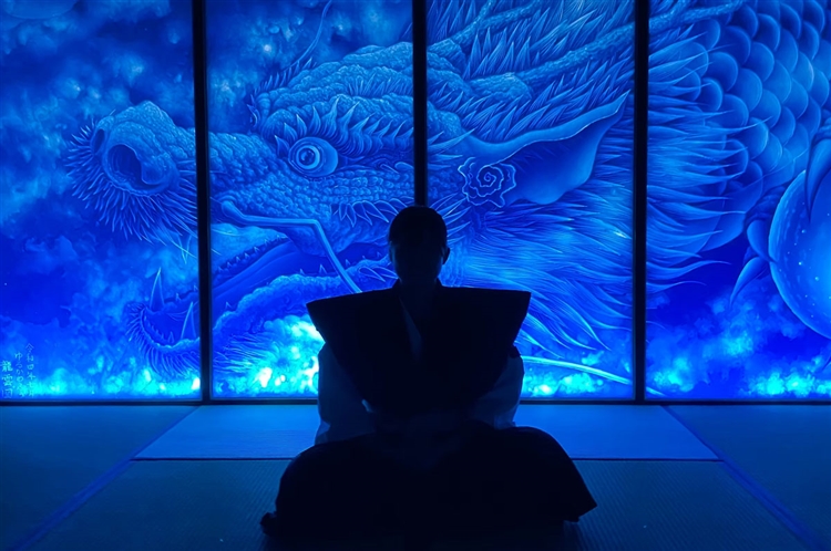 暗闇に浮かび上がる現代アートと禅の伝統芸術の融合が織りなす幻想的な空間が広がります。