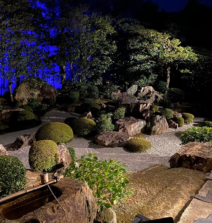 室町時代の画家・狩野元信が作庭した枯山水庭園(国指定名勝)、中根金作の“余香苑”をライトアップ。