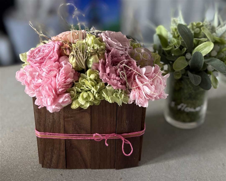 木の器いっぱいに春の花々をあしらい、やわらかな彩りに満ちたフラワーアレンジメントをご体験いただけます。