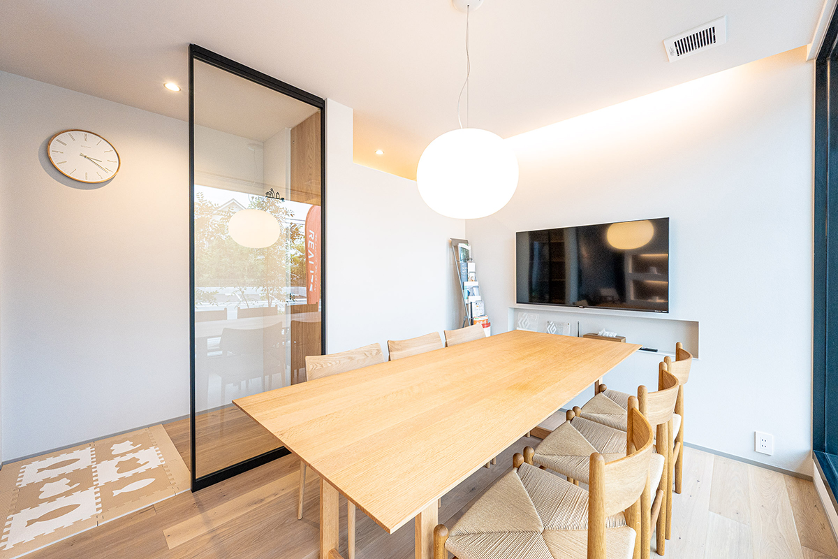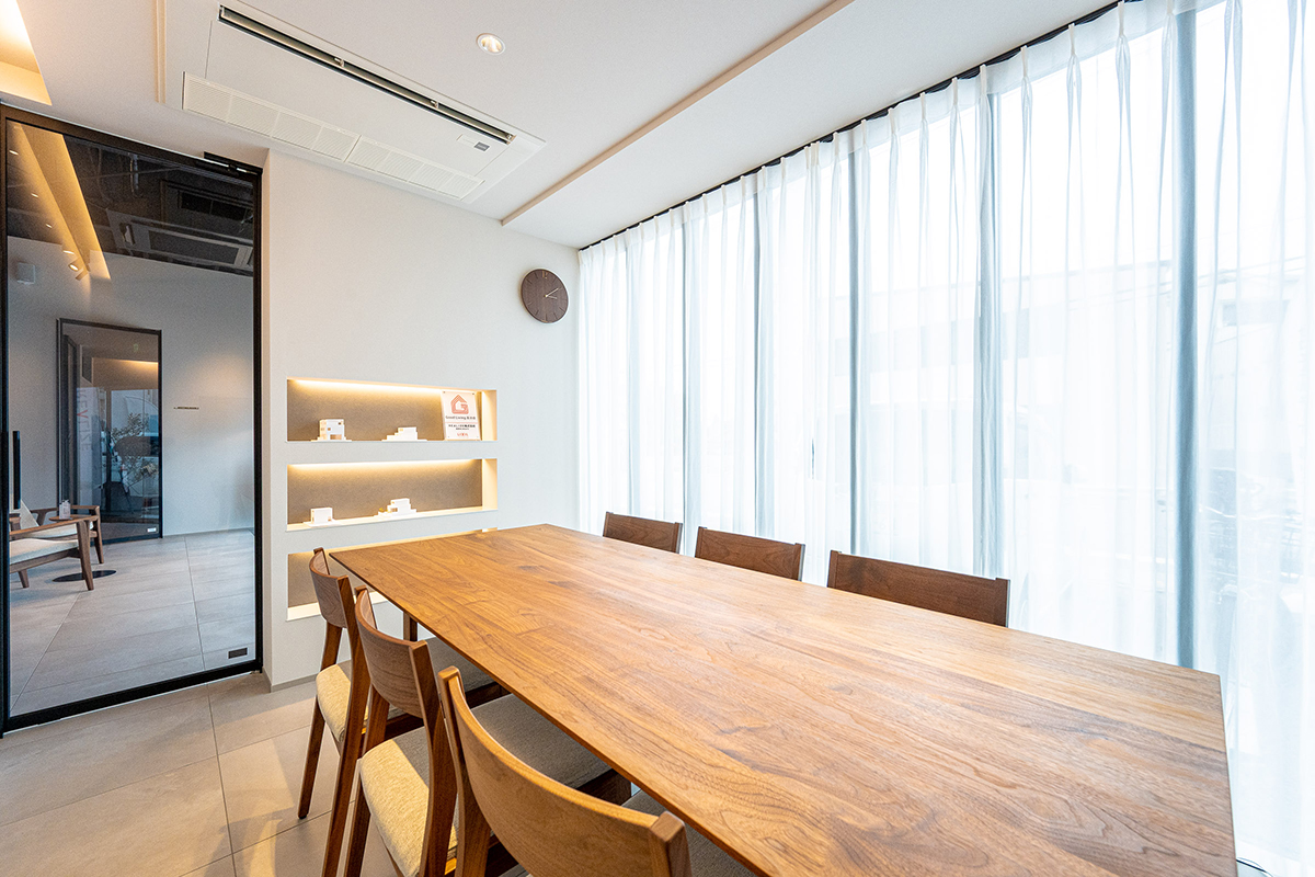 堺市を中心に住宅事業を手がけるREALIZE株式会社のリニューアル店舗。 来客スペースの家具はウォールナットを基調とした重厚感のある空間とオークのナチュラルな空間をつくり、それぞれの異なるテイストを体感できるスペースとなっています。