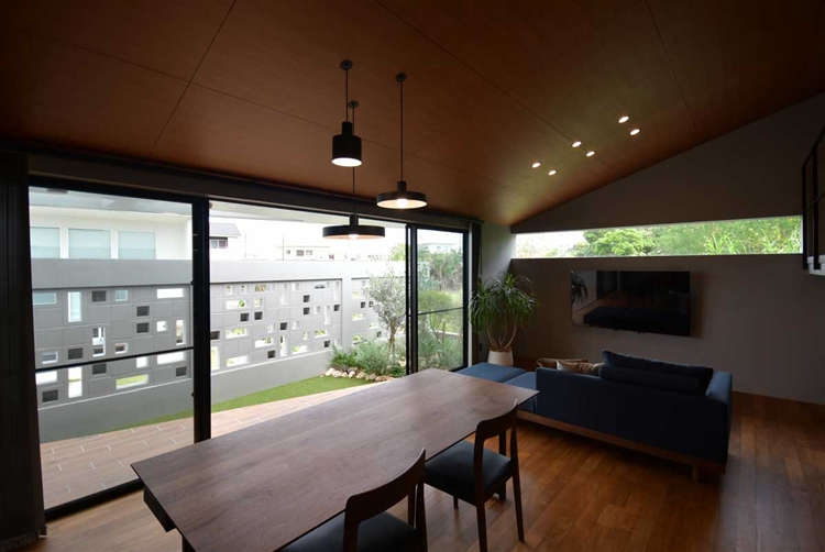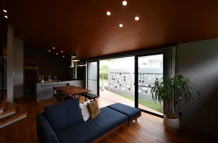 間+impression(マ アンド インプレッション)が手掛けた、沖縄県 Y様邸。 リビングにはレイジーデニッシュソファを配置し、中庭とダイニングを隔てることのない開放感あふれる空間に。 どこからでも家族の心地よい気配を感じられる空間設計──。 ウォールナットと緑に包まれた空間には、穏やかで温かな時間が流れています。
