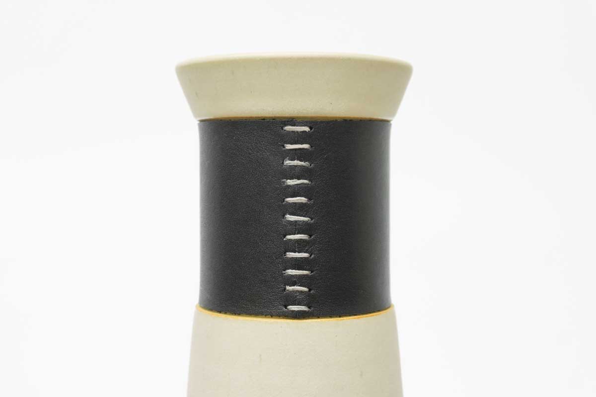 - (WHITE)京都の陶謙窯により手仕事のろくろで製造された陶器に革の端材を巻き付けて手縫いしたフラワーベース¥27,500