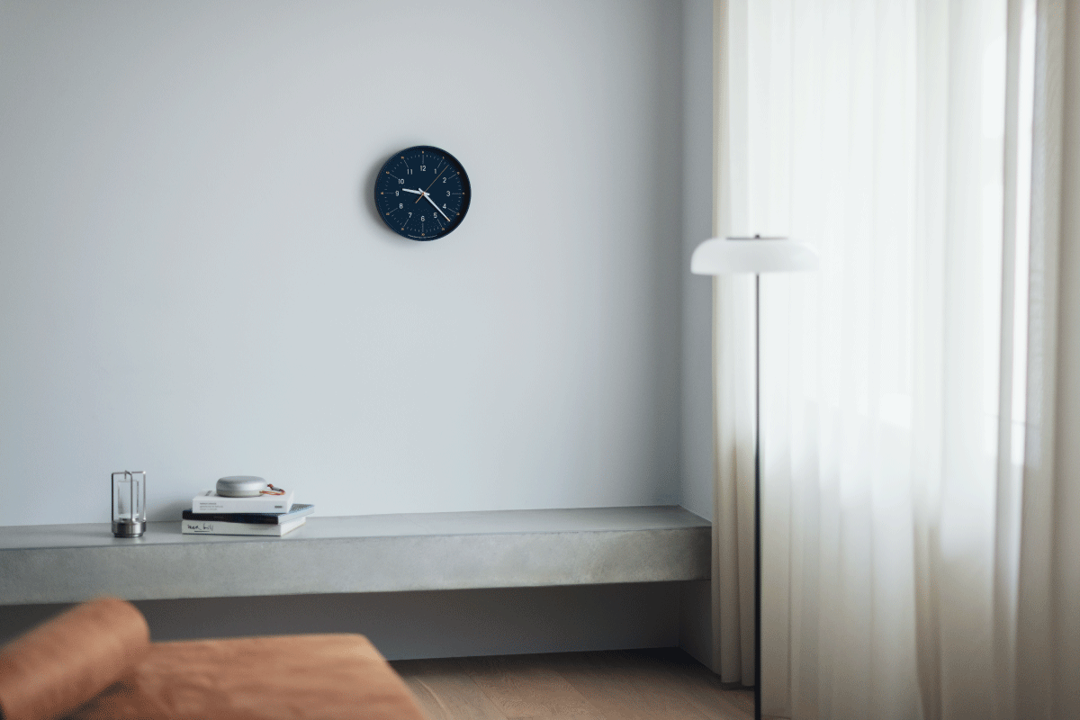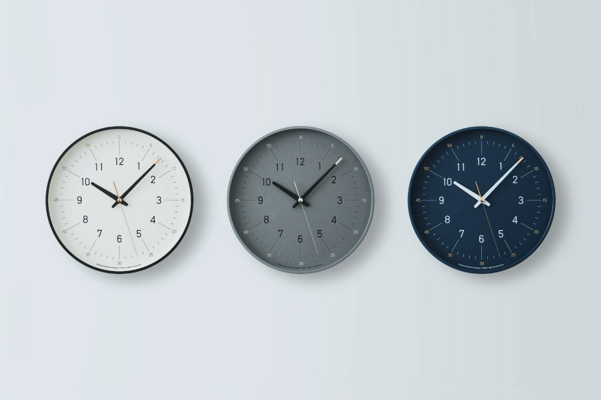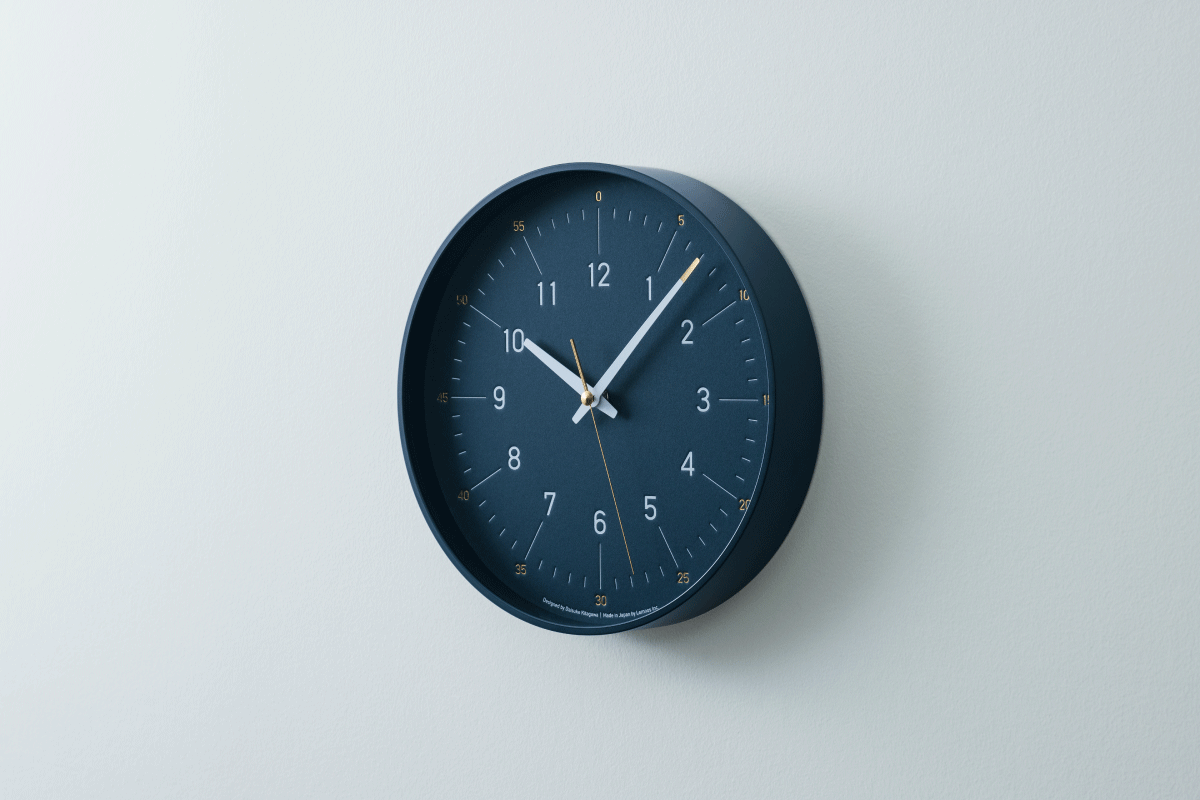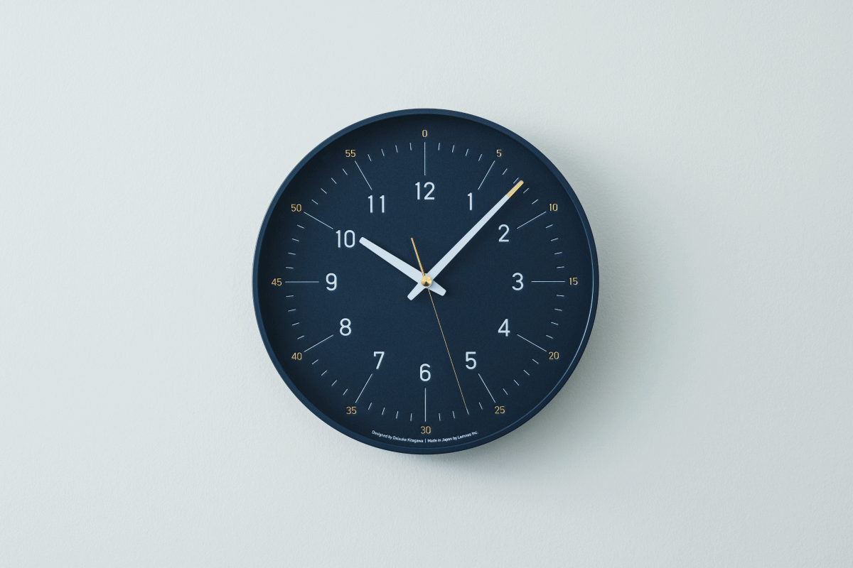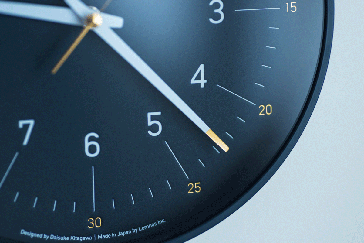 時計には、時間を示す12進法と、分と秒を示す60進法が共存しています。 しかし多くの壁掛け時計は、1から12の時間を示す数字のみが記されています。 そこで、それぞれの数字を自然な形で分かりやすく示すスタンダードな壁掛け時計を目指し、デザインしました。 essentでは、2種の数字を記すだけでなく2種類の色彩を用いることで、より明確な差分を示しています。 時間を示す時針と1から12の数字、分/秒を示す分針と秒針そして0から55の数字。 それぞれの色彩をリンクさせることで、より直感的に時間を認識できます。 機能と素材に本質的に向き合うことで生まれたessentは、こどもからおとなまで読みやすく、どんな空間にも馴染みます。