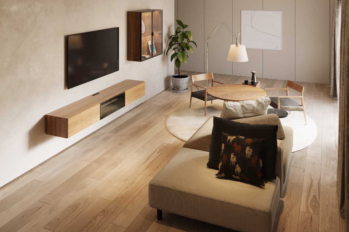 - (W120.7cm×D40.2cm×H28cm)収納の機能が選べる、フロートテレビボード¥181,500 ~ ¥258,500
