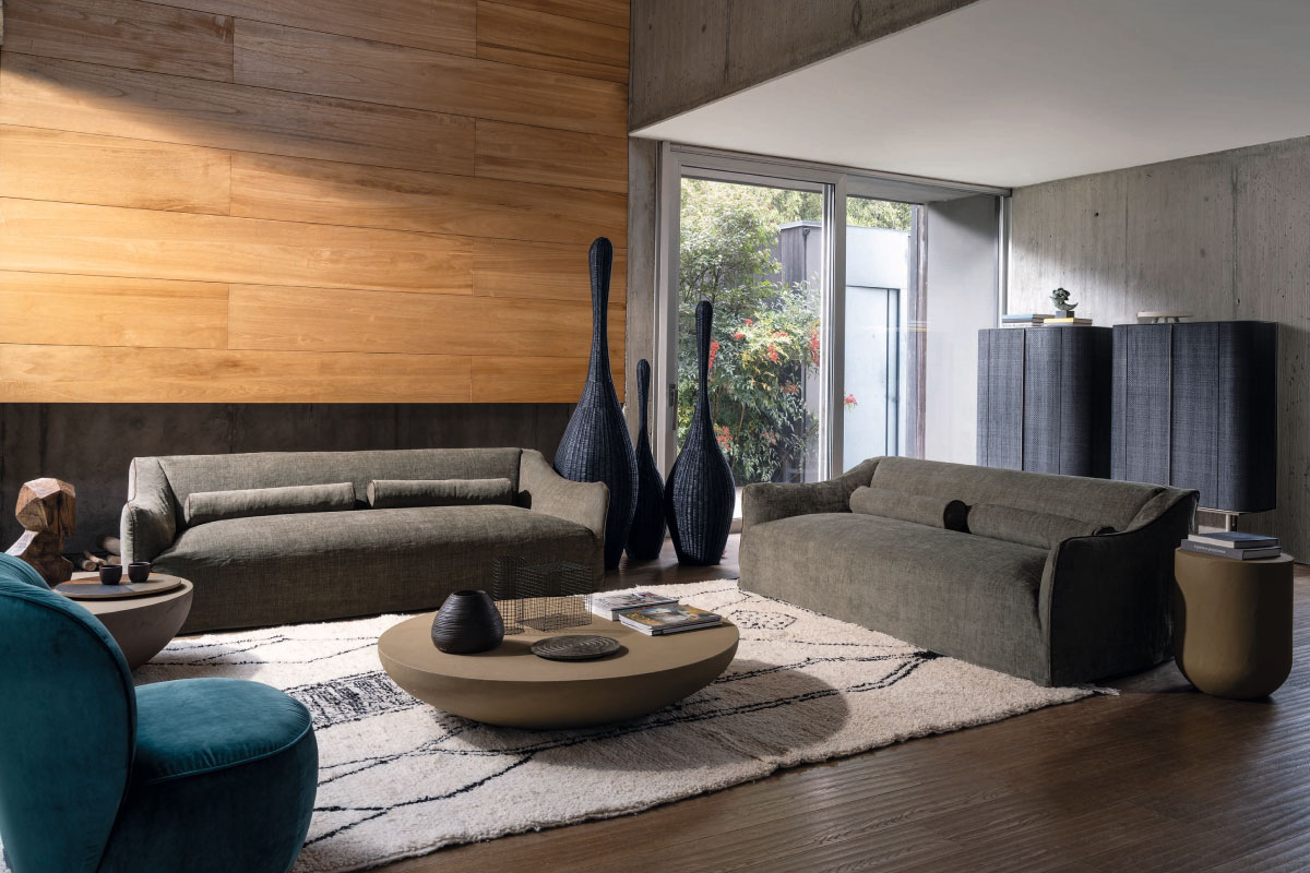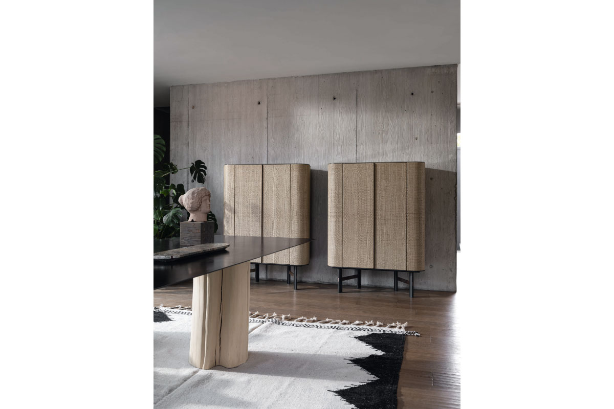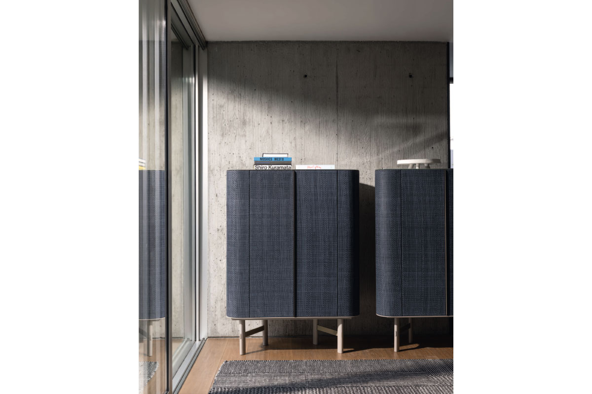 撥水性と手入れのしやすいエコレザーの布張りの扉に、内部には可動式の棚が付いた機能的なハイボード。日本語から「楕円」と名付けられたボリューム感のあるボディと軽やかな脚部が空間にエレガントな雰囲気をもたらすデザインです。