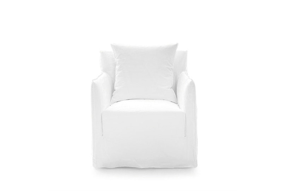 GERVASONIを代表するアイコニックなソファ・チェアのシリーズ、GHOST(ゴースト)のアームチェア。 カバーをすっぽりと被った佇まいは、シンプルでありながらエレガントなデザインです。カバーは簡単に着せ替えが可能で、非常に豪華な外観になるブロッケード生地や、極端にミニマルになる白いリネンなど、ファブリックによって空間の雰囲気を大きく変えることができます。