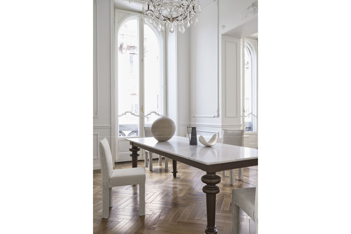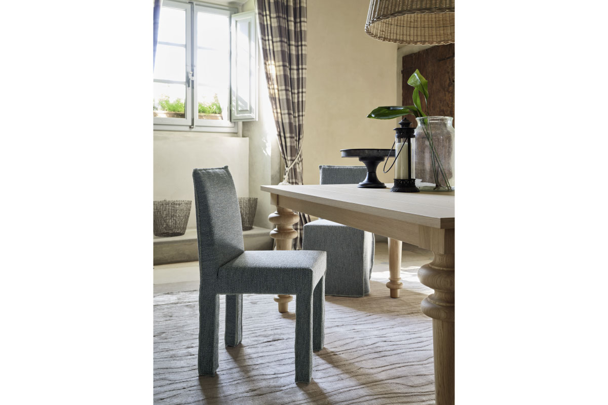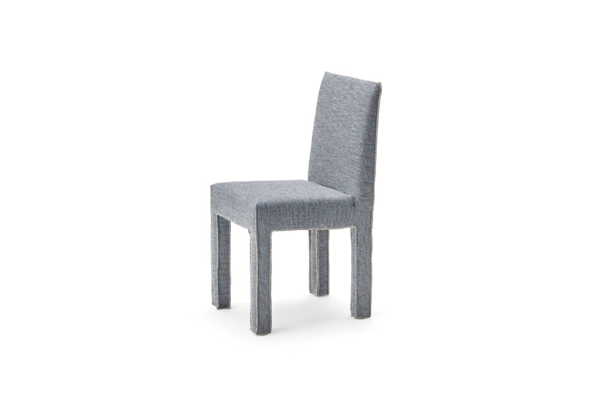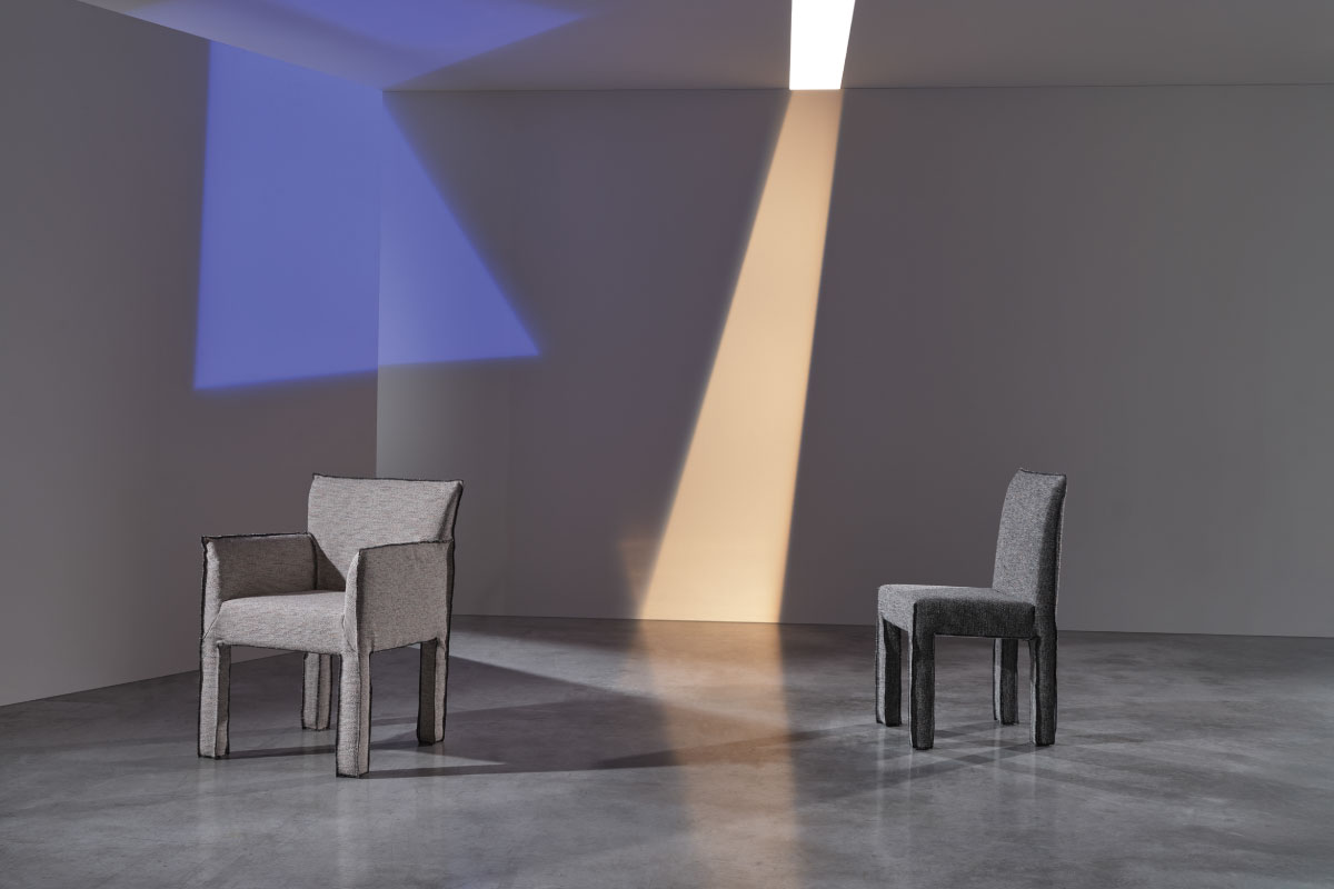 GERVASONIを代表するアイコニックなソファ・チェアのシリーズ、GHOST(ゴースト)。 背もたれと脚が四角いフォルムで構成されたダイニングチェア。全体を覆う張地カバーによって形状にやわらかさが加わり、座面全体を包み込むように施されたそのデザインが、チェアの輪郭とミニマルな構造を際立たせています。洗練されたシャープな幾何学的ラインが特徴です。
