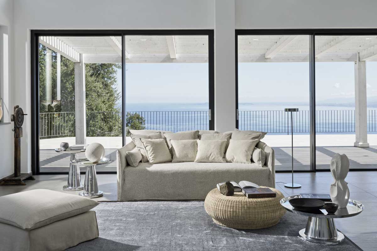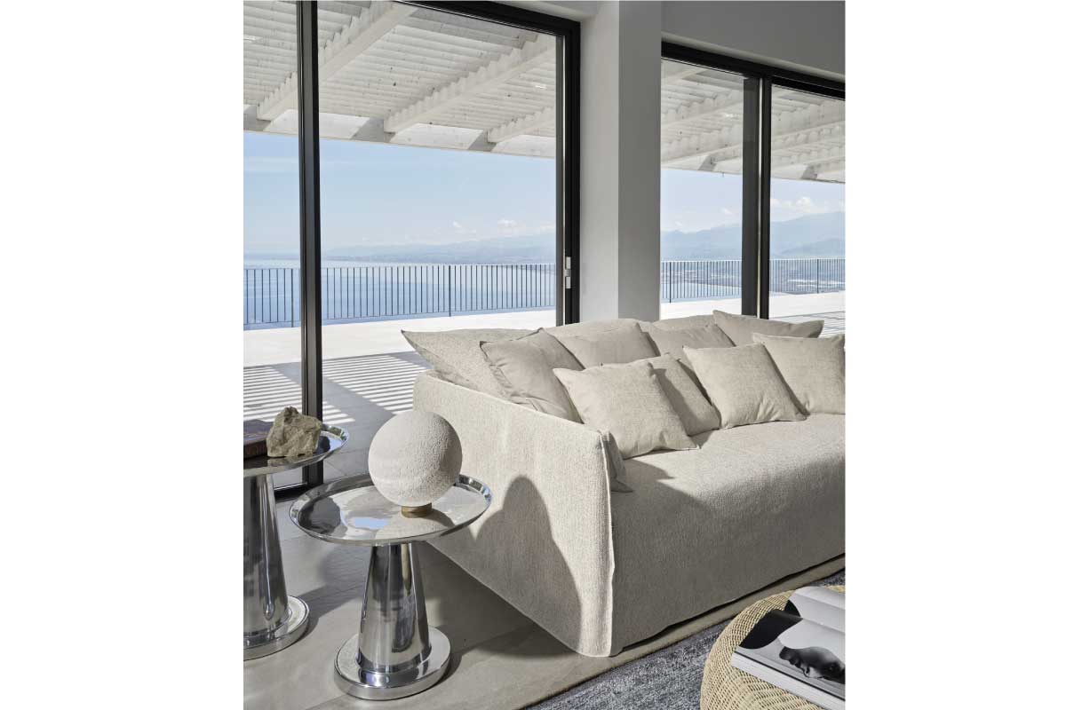 GERVASONIを代表するアイコニックなソファ・チェアのシリーズ、GHOST(ゴースト)のソファ。 カバーをすっぽりと被った佇まいは、シンプルでありながらエレガントなデザインです。カバーは簡単に着せ替えが可能で、非常に豪華な外観になるブロッケード生地や、極端にミニマルになる白いリネンなど、ファブリックによって空間の雰囲気を大きく変えることができます。