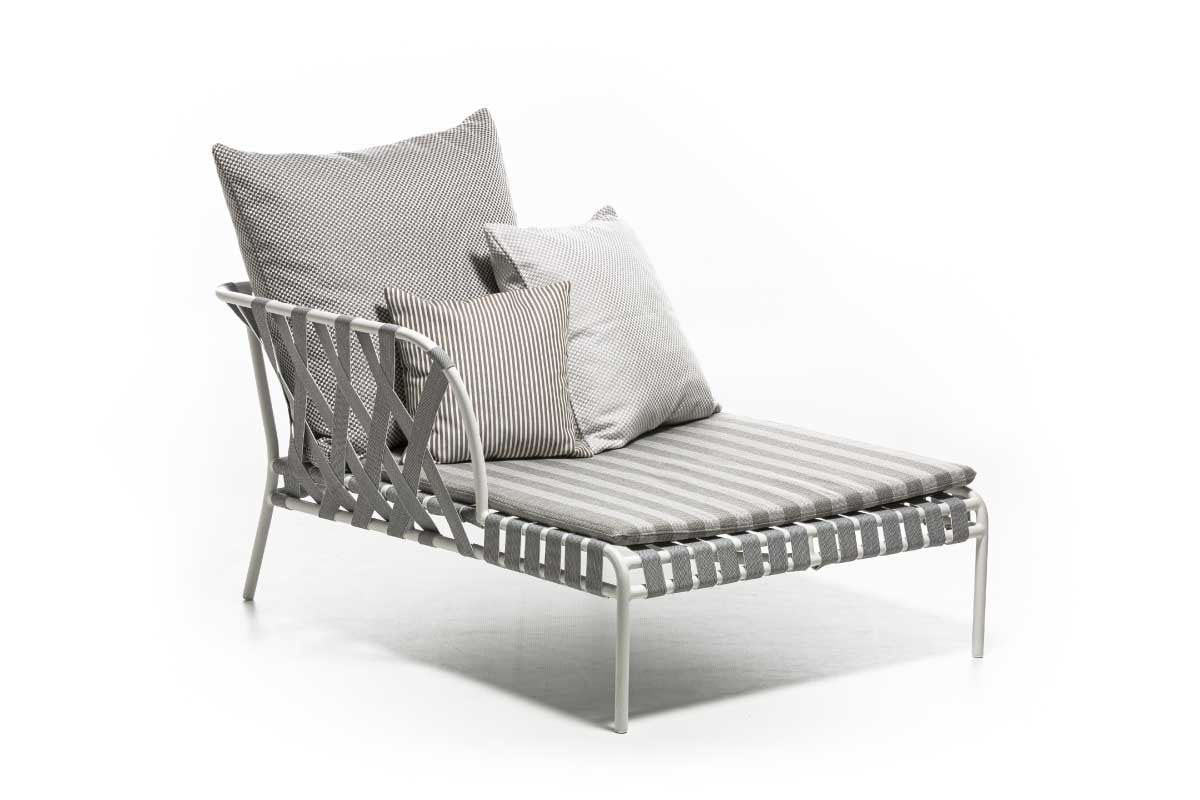 包み込まれるような座り心地のアウトドアアームチェア。堅牢なイロコ材のフレームとクッションの柔らかさのコントラストが個性を引き立てます。