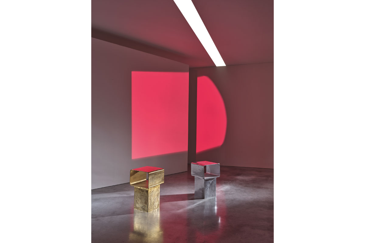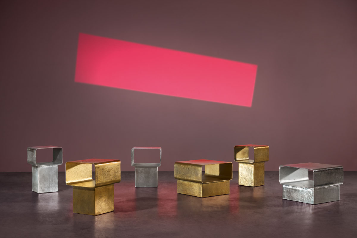 「Kira(キラ)」サイドテーブルは、実体と空間のコントラストが生み出す大胆なデザインが魅力の一台です。 キャストアルミニウム(鋳造アルミ)製で、立方体のベースと角を丸く仕上げたスクエア型の天板が、洗練された幾何学的なフォルムを描きます。 ゴールドまたはクローム仕上げにより、輝きのあるインダストリアルな美しさがさらに引き立てられています。