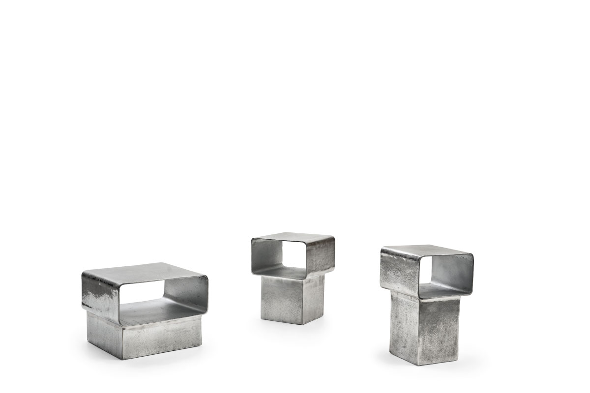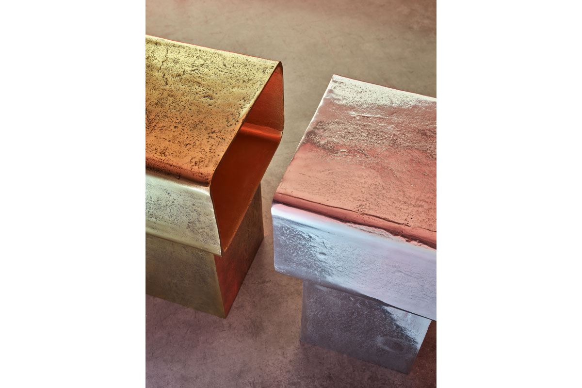 「Kira(キラ)」サイドテーブルは、実体と空間のコントラストが生み出す大胆なデザインが魅力の一台です。 キャストアルミニウム(鋳造アルミ)製で、立方体のベースと角を丸く仕上げたスクエア型の天板が、洗練された幾何学的なフォルムを描きます。 ゴールドまたはクローム仕上げにより、輝きのあるインダストリアルな美しさがさらに引き立てられています。