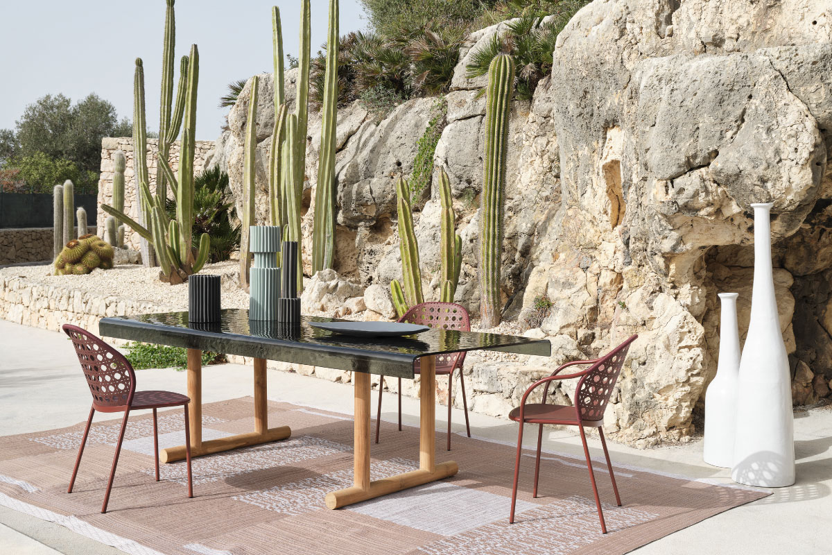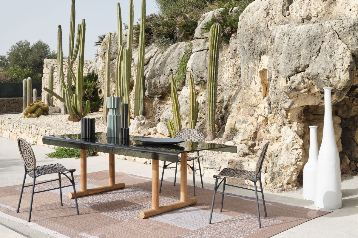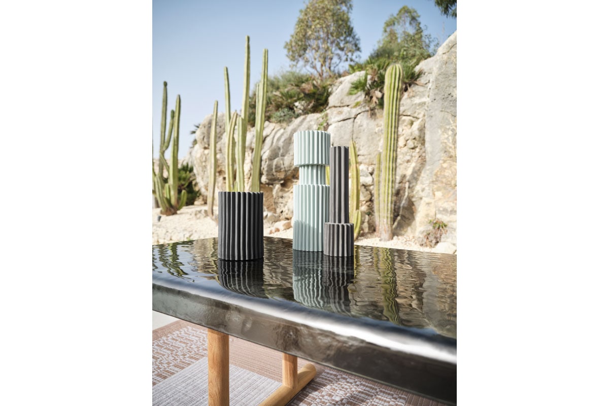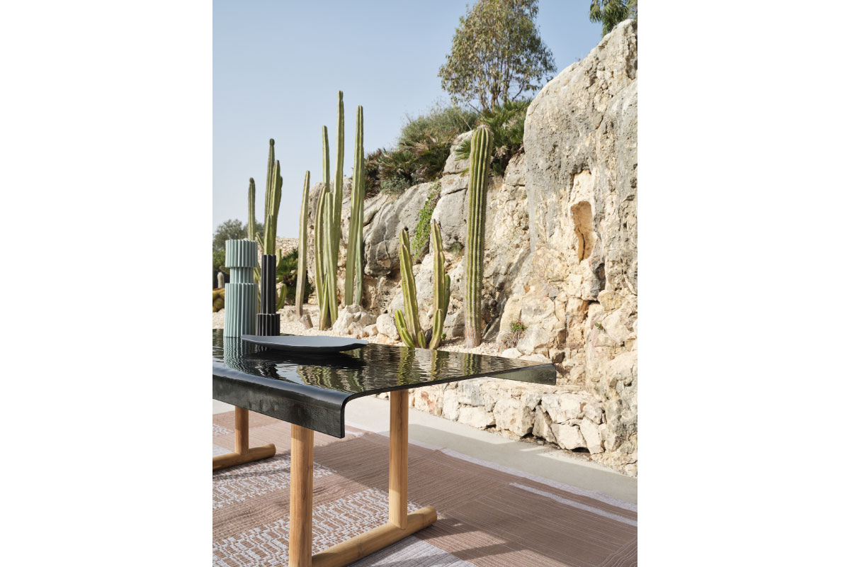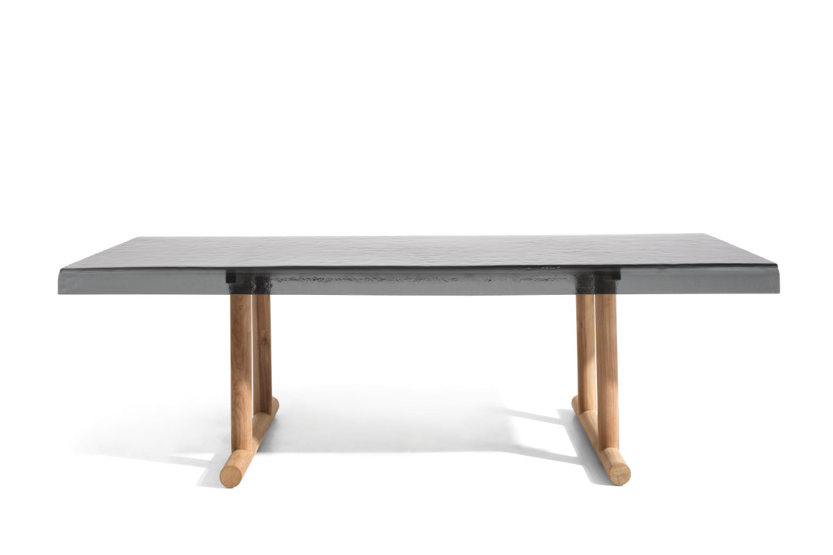 「Torii(トリイ)」テーブルは、Studio Adoliniによってデザインされ、エレガントで直線的な美しさが際立つ一台です。名前の由来となった伝統的な日本の鳥居をインスパイアしたチーク材のベースが、コンクリートまたはスモークガラスの天板を支えています。天板の形状は、下向きに折りたたまれたエッジが特徴的で、彫刻的なデザインが印象的です。Toriiは洗練されたシンプルさを表現しており、機能性と美しさを兼ね備えた一品を求める方にぴったり。どんな空間にもスタイルの中心となる、真の存在感を放つテーブルです。
