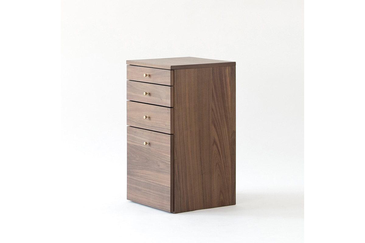TOKI - トキ 子どもから大人へ、親から子どもへと、形を変えながら時代や世代を越えて使い続けて欲しいシリーズの1つです。家族が集うリビングへの設置を考慮し、奥行きを必要最小限(40cm)としました。奥行きが共通のAPARTMENTとの併用にも適しています。子どもと大人で製品の質に差を付けず、幼い時から良質のものに触れてもらいたいという想いが込められたシリーズです。 CHEST DRAWER 真鍮のつまみが印象的なミニマルなチェストです。真鍮特有の経年変化をお愉しみいただけます。最下段の引出には、A4サイズのファイルを収納することができます。