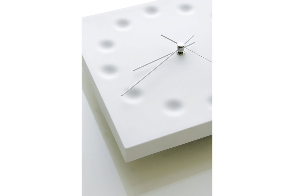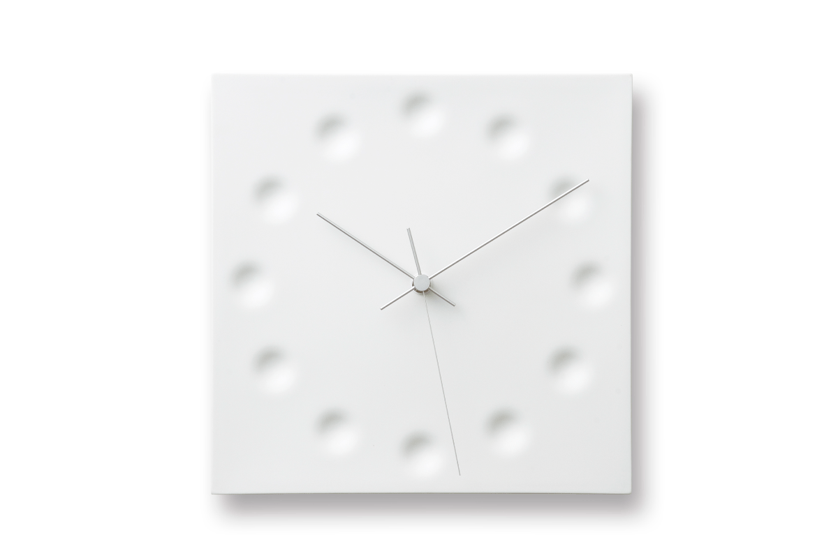 昔どこかの軒下で雨宿りをした時に見た、ひさしからの水滴が地面に描く形をモチーフにした時計です。 なだらかな凹凸が作る柔らかな陰影が存在感を引き立たせます。 純白のマットな磁器の質感にシャープで美しい針が上品な雰囲気を醸し出しています。
