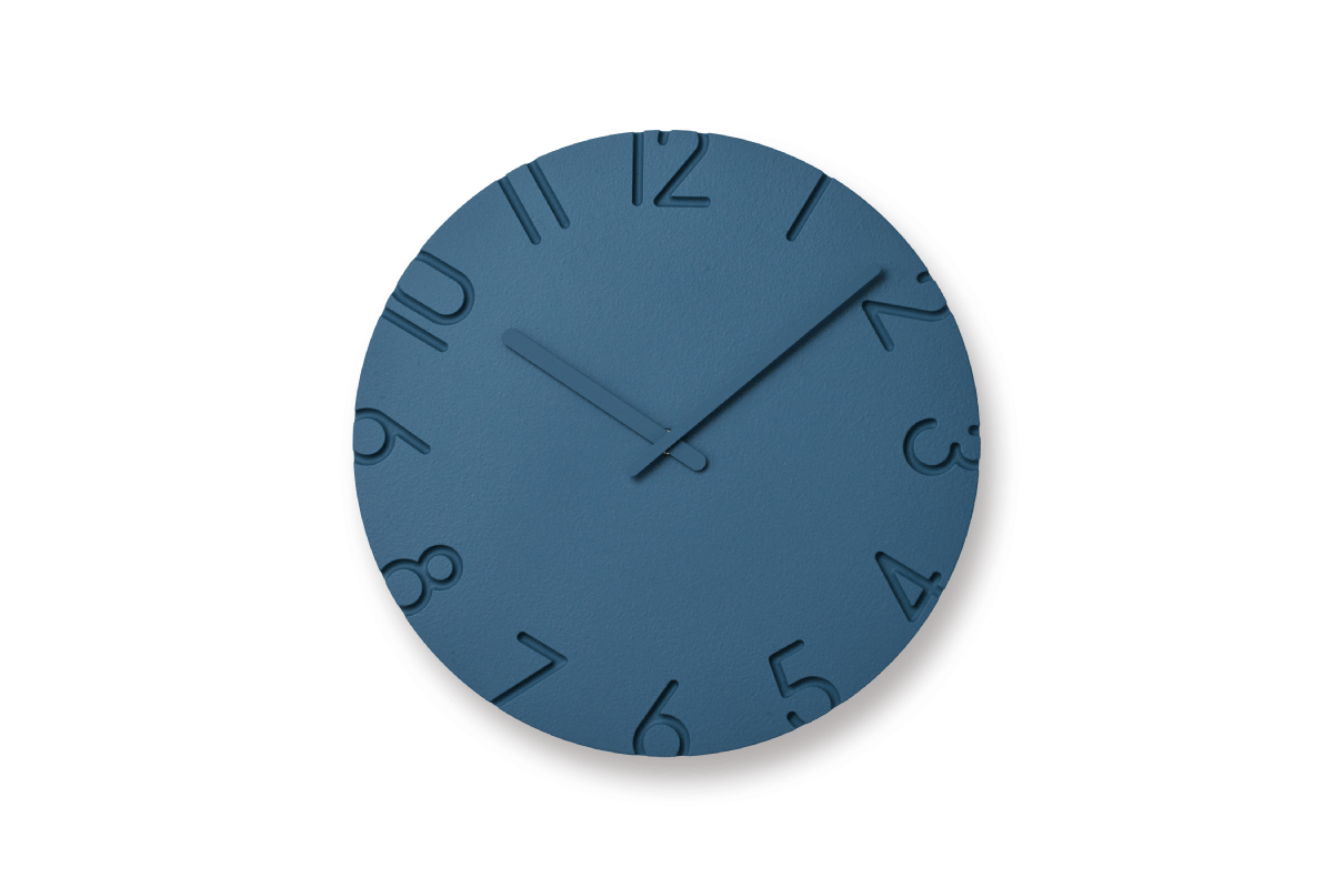 文字盤に色をつけることによって、彫り込んだ文字が色のグラデーションのようにも見え、ミニマムなフォルムながらも空間に色のアクセントを与えます。