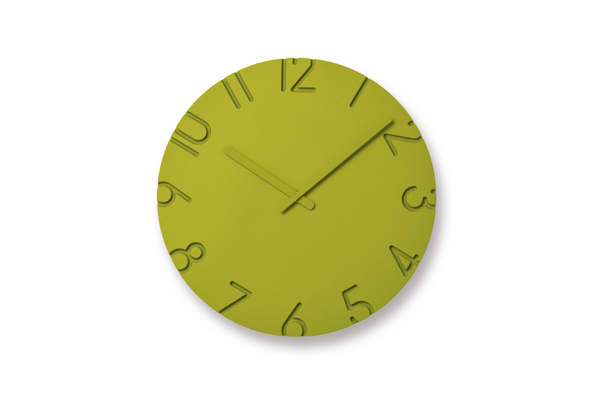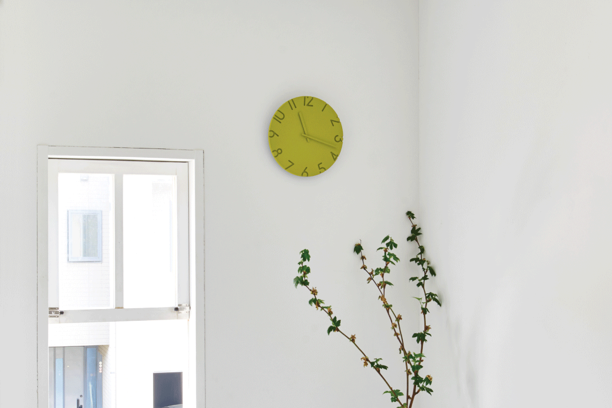 文字盤に色をつけることによって、彫り込んだ文字が色のグラデーションのようにも見え、ミニマムなフォルムながらも空間に色のアクセントを与えます。