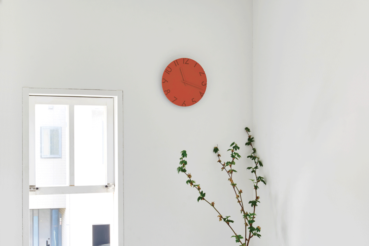 文字盤に色をつけることによって、彫り込んだ文字が色のグラデーションのようにも見え、ミニマムなフォルムながらも空間に色のアクセントを与えます。