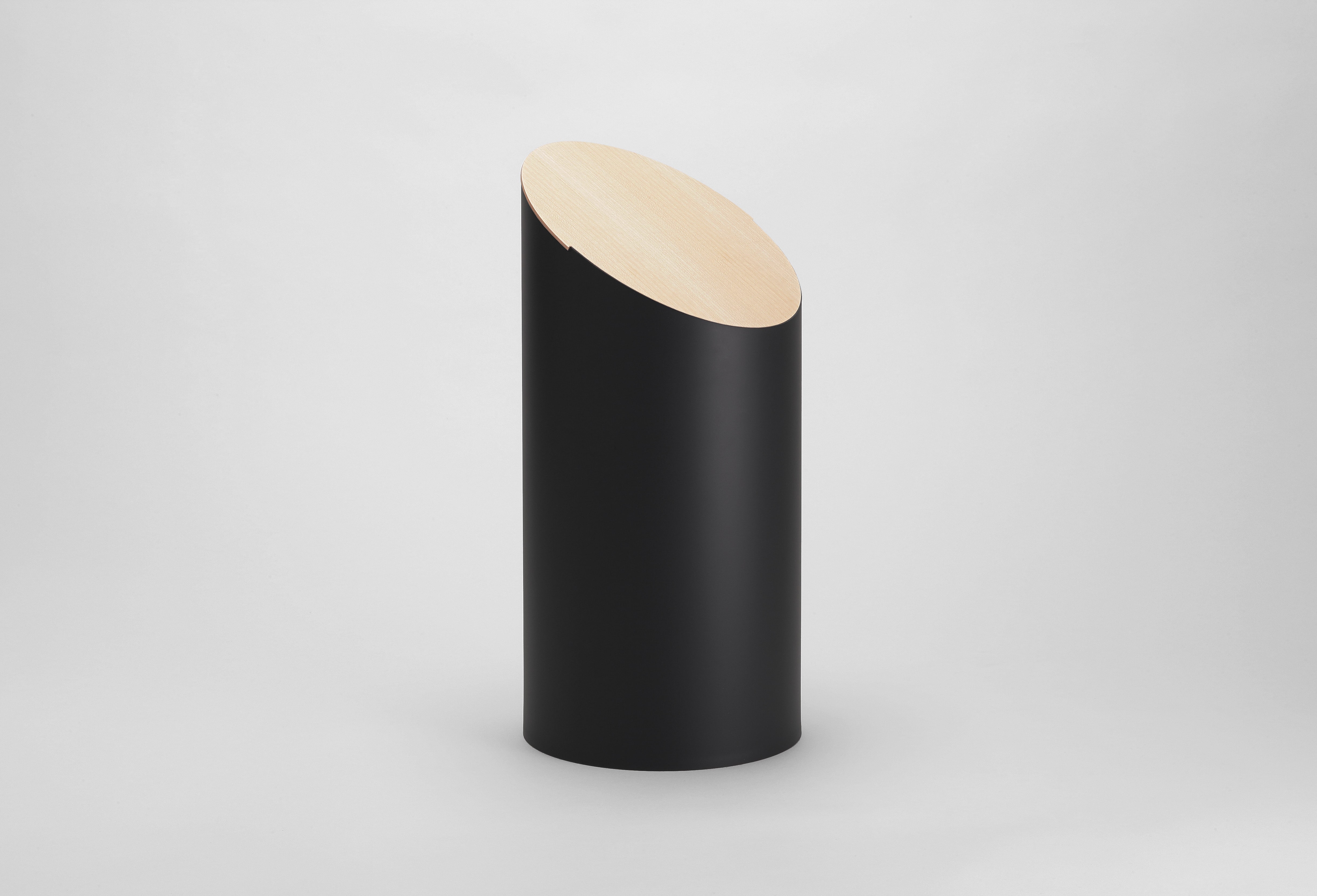 丸太木を斜めに切り落としたようなプリミティブなフォルムが、彫刻のように静かに美しく佇みます。計算され尽くした角度と構造により、そっと置くだけで機能する蓋。すとんと垂直に描かれたフォルム。どんなインテリアにも映える存在感。SWING BINのそのすべてに、究極のミニマリズムが体現されています。