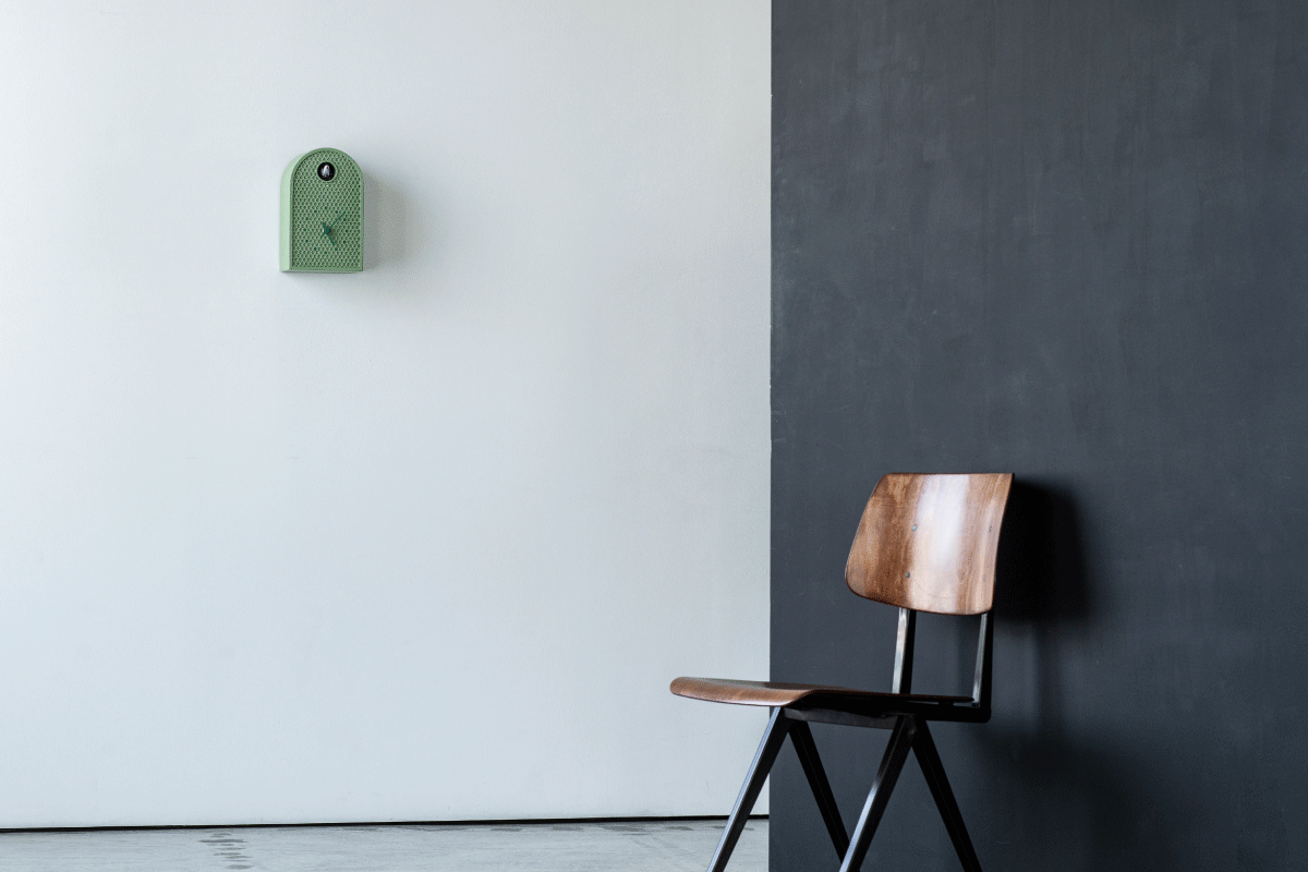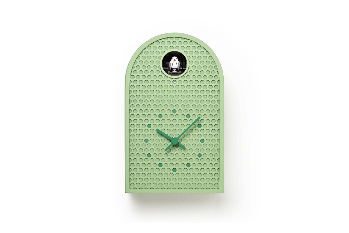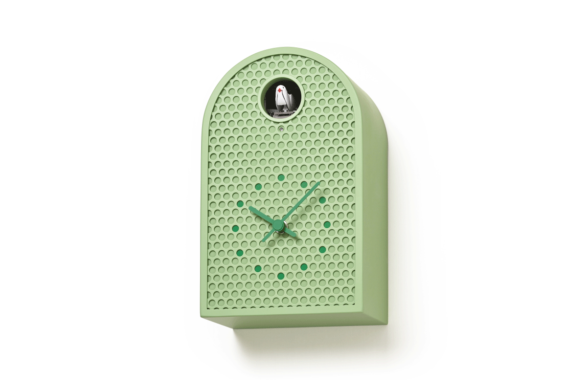 COO(クー)はパンチングメタルを用いた金属製のカッコー時計です。 西洋で古くから見られるアーチ型窓の外形をモチーフにした、金属板を半円状に曲げた外形を持ち、工業的な素材にアンティーク調の要素をミックスすることで、金属製でありながら温かみを感じます。 正面にはパンチングメタルを用いる事で、多数の孔がカッコーの大きな丸穴と合わせてグラフィカルかつ軽快な印象を与えます。 時計の指標部分は孔の位置に合わせた箇所に色を付けた、本体と一体感のある表現になっています。 カラーはホワイト、アイボリー、ミントブルー、グリーンの4色で、インテリアに馴染みやすい落ち着いたトーンをベースにしており、針と指標にアクセントとなる強いカラーを加えています。 金属板で構成されたケースには新潟地方で培われた金属加工の切り抜き、曲げ、溶接、塗装技術が活かされており、高い精度が求められるパンチング板を切り抜く量産加工も実現しています。 金属板を構造体に用いる事で耐久性と質感の高さを持ちながら、パンチングメタルが軽量化に寄与し、モダンインテリアに相応しい新たな時計のかたちを作っています。