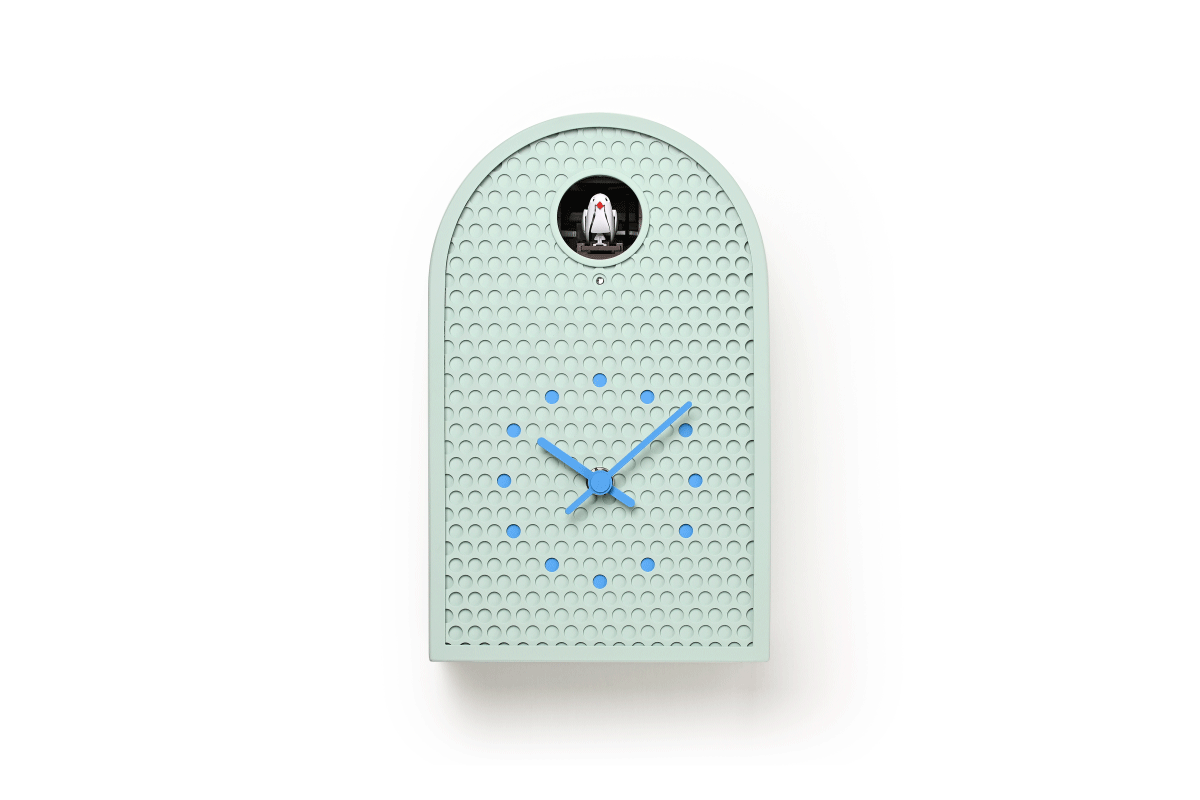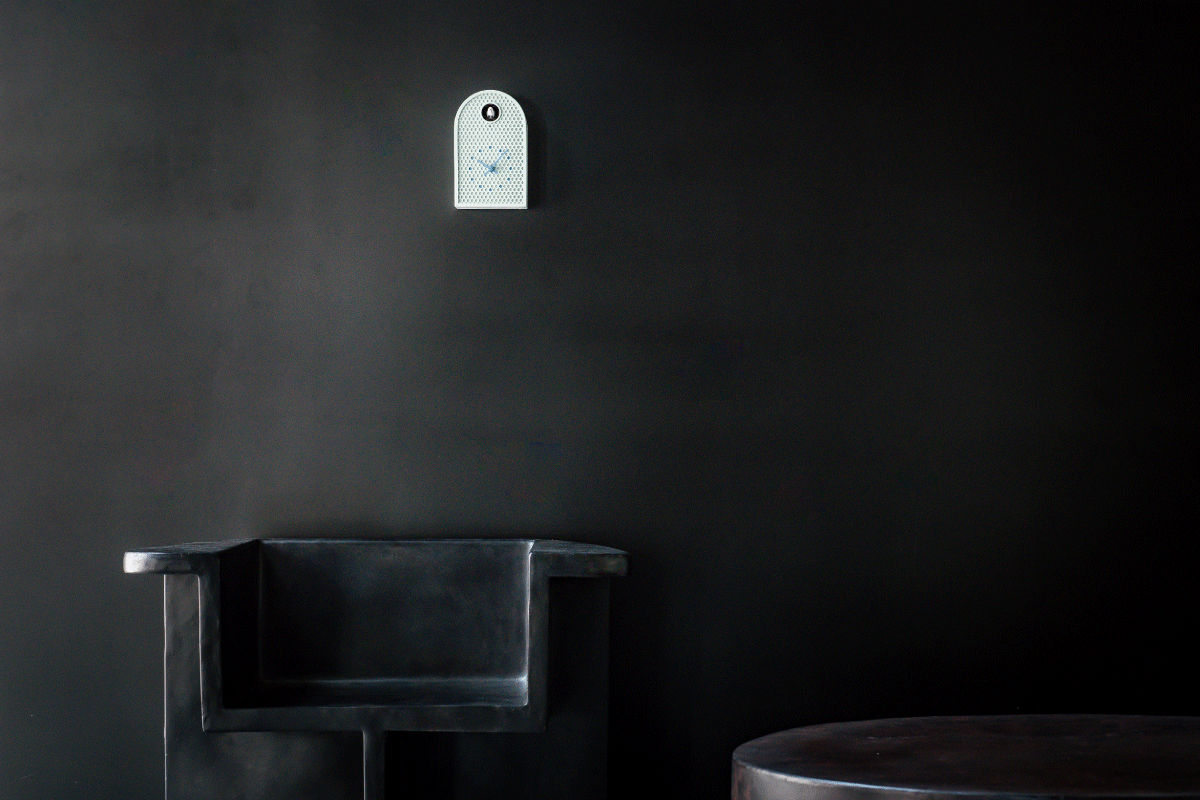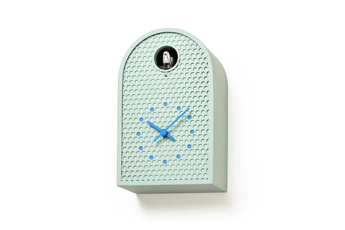 COO(クー)はパンチングメタルを用いた金属製のカッコー時計です。 西洋で古くから見られるアーチ型窓の外形をモチーフにした、金属板を半円状に曲げた外形を持ち、工業的な素材にアンティーク調の要素をミックスすることで、金属製でありながら温かみを感じます。 正面にはパンチングメタルを用いる事で、多数の孔がカッコーの大きな丸穴と合わせてグラフィカルかつ軽快な印象を与えます。 時計の指標部分は孔の位置に合わせた箇所に色を付けた、本体と一体感のある表現になっています。 カラーはホワイト、アイボリー、ミントブルー、グリーンの4色で、インテリアに馴染みやすい落ち着いたトーンをベースにしており、針と指標にアクセントとなる強いカラーを加えています。 金属板で構成されたケースには新潟地方で培われた金属加工の切り抜き、曲げ、溶接、塗装技術が活かされており、高い精度が求められるパンチング板を切り抜く量産加工も実現しています。 金属板を構造体に用いる事で耐久性と質感の高さを持ちながら、パンチングメタルが軽量化に寄与し、モダンインテリアに相応しい新たな時計のかたちを作っています。
