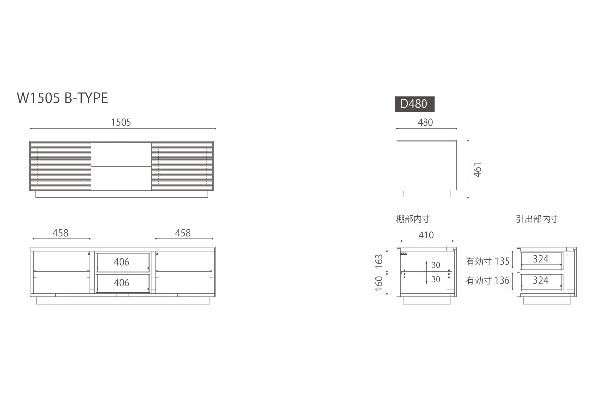 - (W150cm × D48cm)美しい木目と大容量の収納を備えたテレビボード¥176,000 ~ ¥341,000