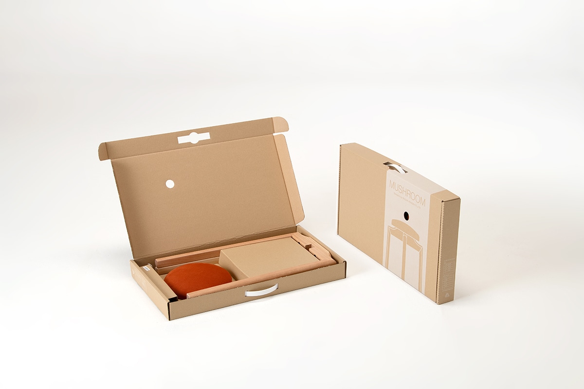 このデザインは、日々の暮らしの中ある「ちょっと腰掛けたい」という思いを叶えるために生まれました。キッチンや玄関、パウダールームなどスペースがかぎられ、かつ足ったり座ったりを動作の多い場所でマッシュルームスツールはさりげなく暮らしに寄り添います。そして、この見た目からは想像もできないタフな造りは、カバ材と匠工芸の揺るぎない高い技術力によるもの。特に、重量負荷の強くかかる脚の接合部には押しになく職人の技が注がれています。それを、だれでも簡単に組み立てられるノックダウン式に設計することで、スリムかつシンプルなパッケージングを実現させました。
