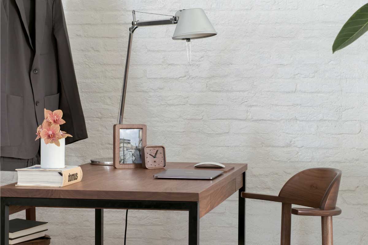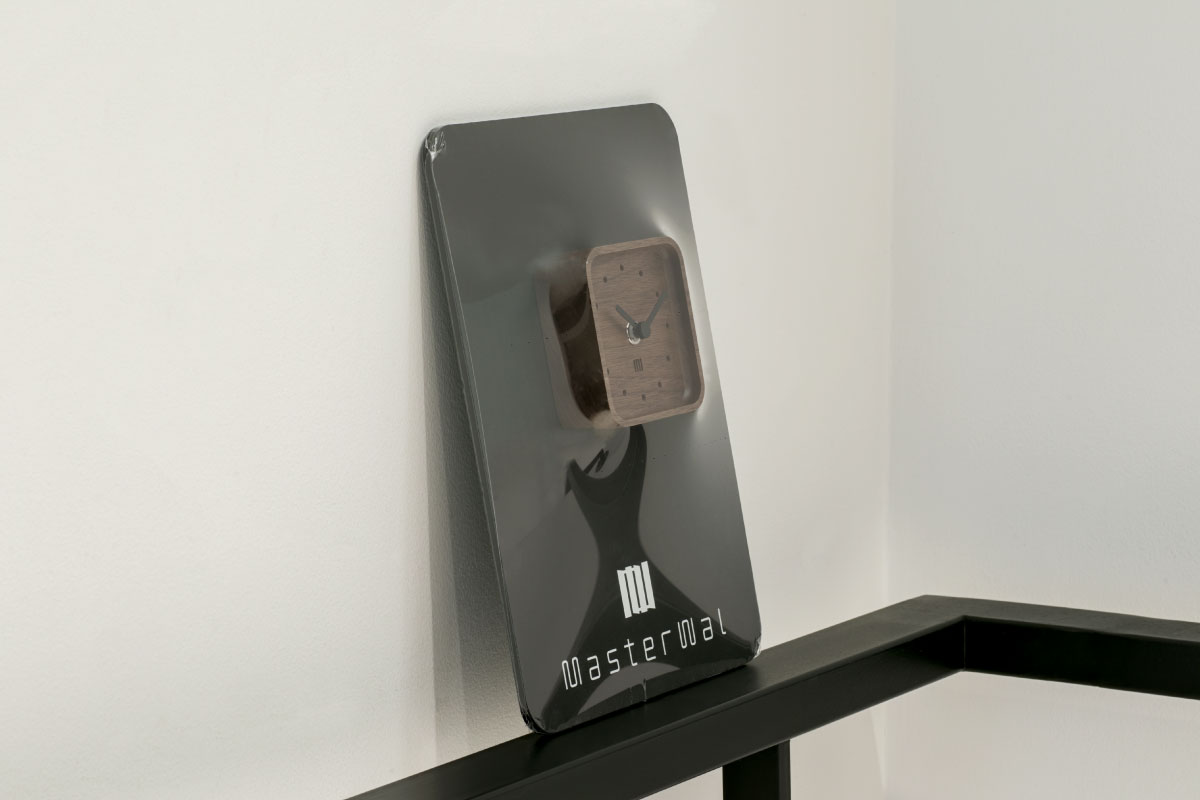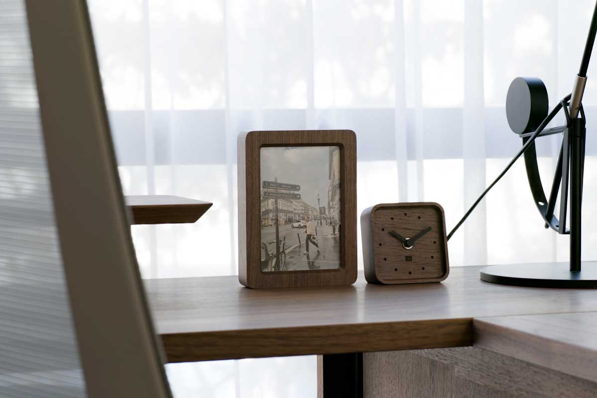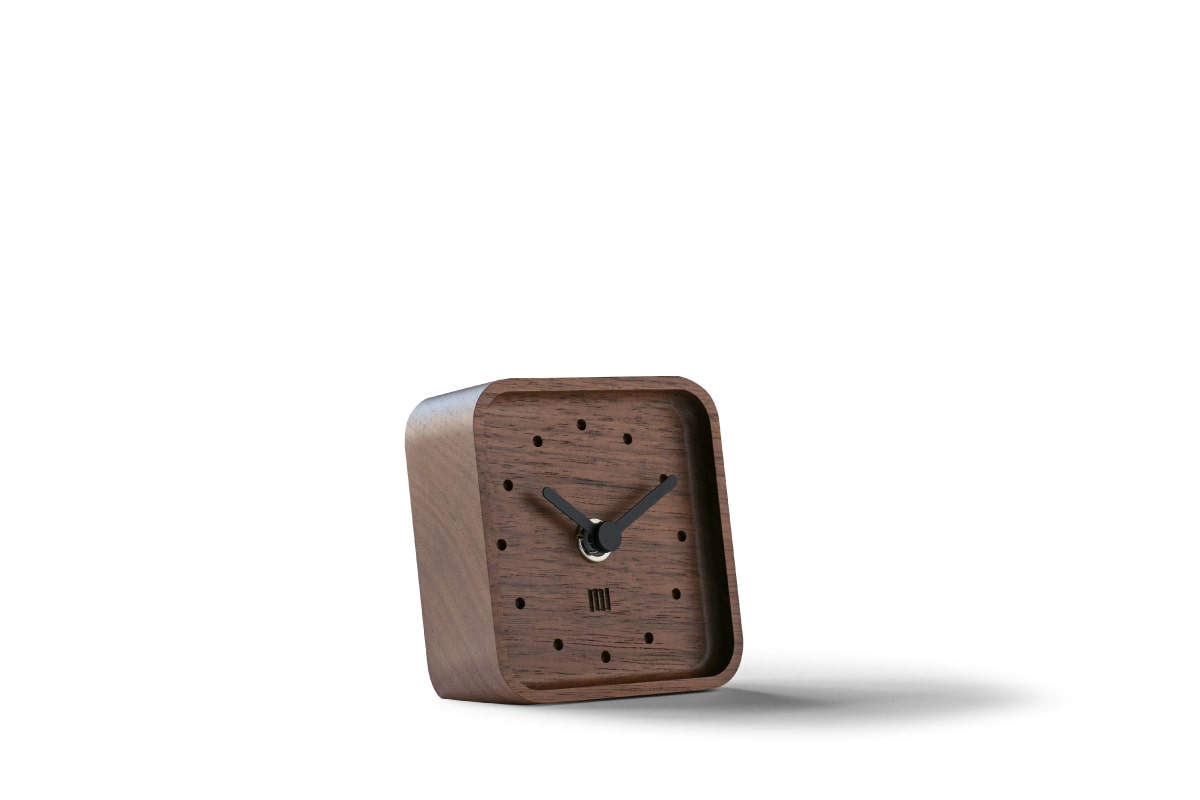 ウォールナット材を削り出し、文字盤もかわいいでデスククロック。 角のアールを取ったデザインは見た目やさしく、手にすると角がない柔らかさを実感します。 表面の真ん中にマスターウォールロゴを配置。 空間のアクセントとなる無垢の質感をお愉しみください。