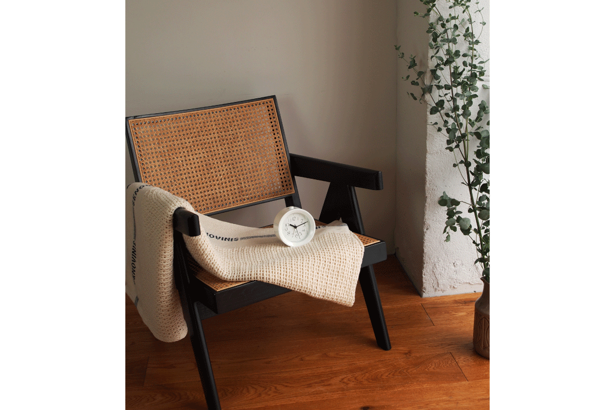 RIKI ALARM CLOCKは、大きめの12個の数字を使用した視認性の高い文字盤とシンプルなフォルムが美しく融合されています。木製の丸みを帯びた枠体は、軽やかで、柔らかな印象を与えます。木目の美しさが特徴的です。