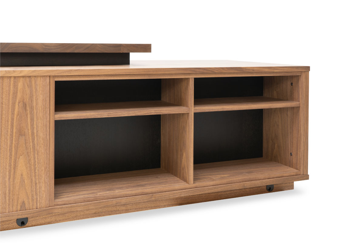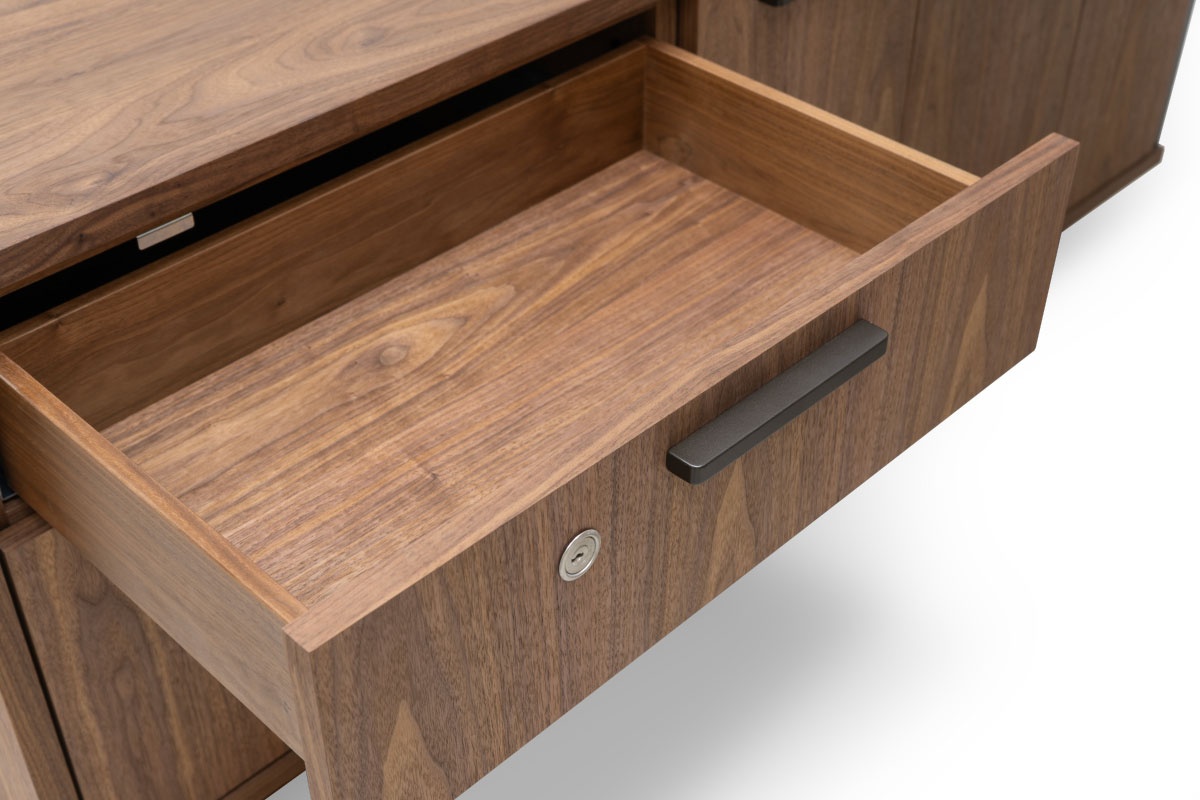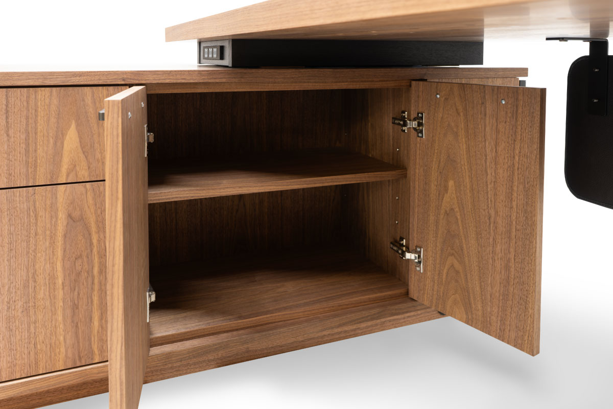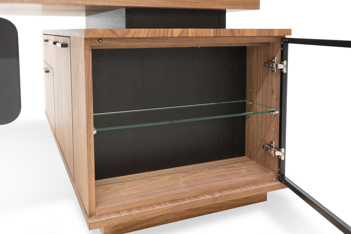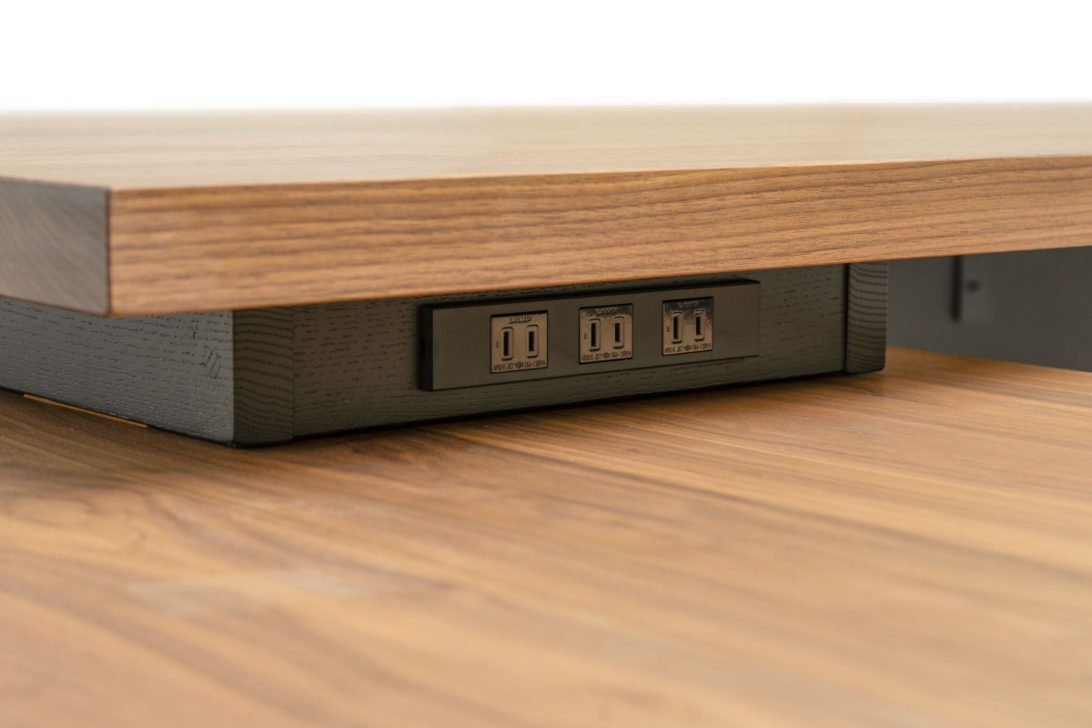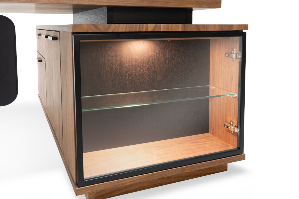 無垢材の力強い質感とスチールの直線美が調和した、上質な存在感のL字型エグゼクティブデスクです。 広い天板とガラスキャビネットが、ワークスペースに奥行きと品格をもたらします。 本革パネルや照明演出により、デスク周りを落ち着いた特別な空間へと整えます。 素材・仕上げ・構成のすべてにこだわり、長く愛用できる佇まいを追求した一台です。 ・最高グレード「マスターグレード」の天板 ・引出し、キャビネット、オープン棚など複数の収納ユニット構成 ・仕事時間を豊かにする上質なデザイン おすすめのシーン ・エグゼクティブルーム・オフィス ・ホームオフィス ・書斎・ワークスペース 機能・カスタマイズ ・鍵付きドロワーズ ・3口コンセント搭載 ・収納ボックスは左右どちらにも組み換え可能 ・ガラス扉+LED照明のキャビネットを搭載 永く愛用できる設計 ・41mm無垢天板と重厚な構造 ・オイルの塗りたしや研磨による、セルフメンテナンス可能な天板(ウレタン塗装は不可) ・時代に左右されない普遍的なデザイン