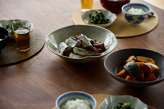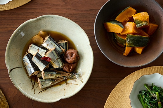 今日も34度か〜。そろそろ秋を迎えに行かないと。秋刀魚には梅、思いやりを感じる今回の献立に沿うセレクトです。
