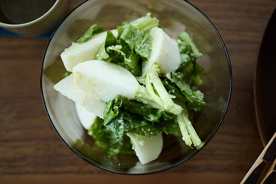 かぶは葉を少し残して葉と切り分け、6等分のくし形に切って皮をむく。